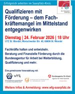 Die Wirtschaftsförderung Saarpfalz (WFG) berät im Saarpfalz-Kreis:– Unternehmen, insbesondere Kleine und Mittlere Unternehmen (KMU), Handwerksbetriebe, Einzelunternehmen– Personen, die eine Existenzgründung planen oder ein Unternehmen übernehmen möchten Die WFG informiert über:– Zuschüsse, Investitionsförderungen, Förderdarlehen für Vorhaben im Saarland– Kooperationsmöglichkeiten mit Start-ups,… weiterWFG Wirtschaftsförderungsgesellschaft Saarpfalz mbH – Partner für Unternehmen und Gründende im Saarpfalz-Kreis