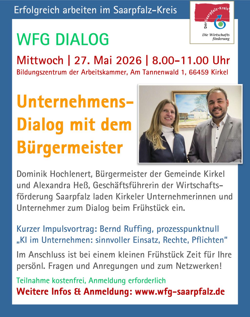Die Teilnahme ist kostenfrei. Die Teilnehmerzahl ist begrenzt, deshalb bitte anmelden, auch damit wir besser planen können! Anmeldung einfach hier: https://eveeno.com/unternehmensdialogkirkel oder kurz anrufen: 06826 5202-0.